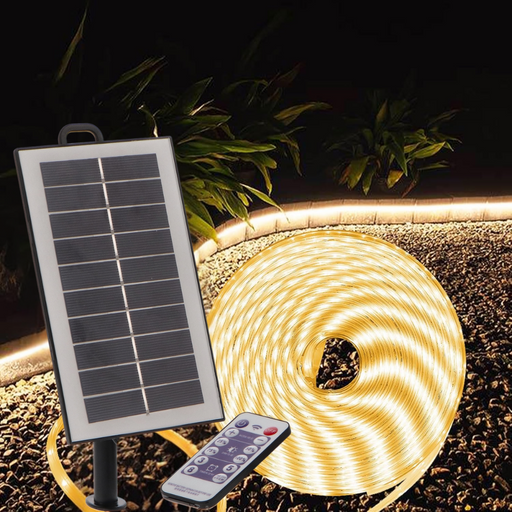 Kit Bandă LED Solară 5 metri – Lumină Caldă 3000K, Dimabilă, cu Senzor Crepuscular, IP68, cu Telecomandă, 300LM – Exterior Banda LED solară de 5 me...