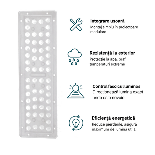 Lentila optică LED - Dispersie Largă pe Orizontală și Restrânsă pe Verticală Concepută pentru performanță și precizie, lentila optică LED 145ºx70º...