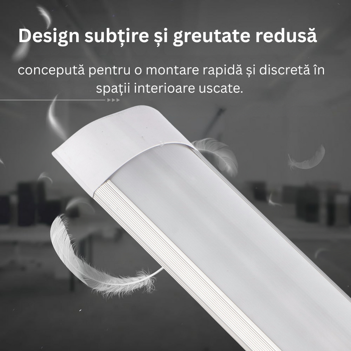 Carcasa ușoară și ultra-subțire din aluminiu și policarbonat facilitează instalarea rapidă, chiar și în spații greu accesibile. Cu o durată de viață de până la 50.000 de ore, protecție IP20 și o temperatură de culoare de 6000K (lumină rece) sau 4500K ( lumină neutră), este o alegere durabilă și performantă pentru birouri, depozite, coridoare sau garaje.
