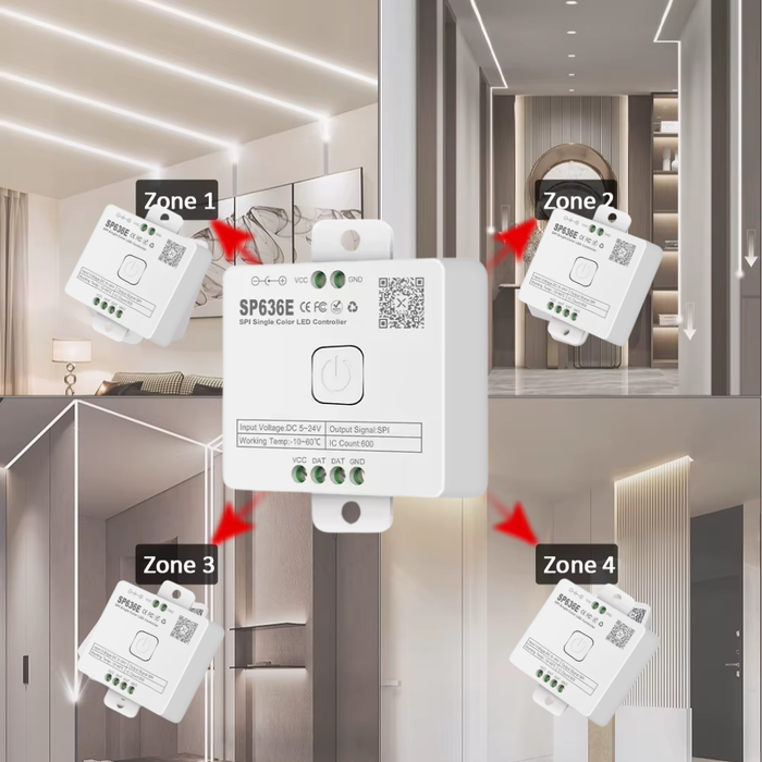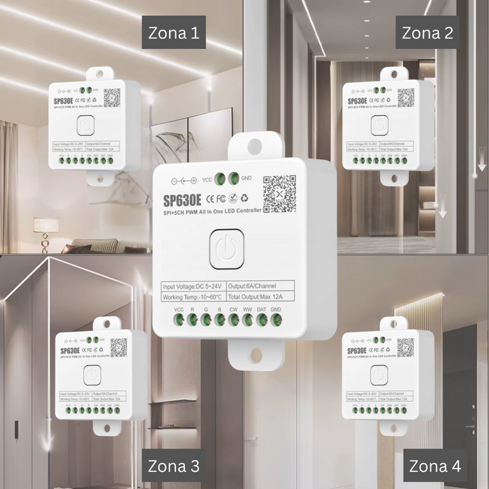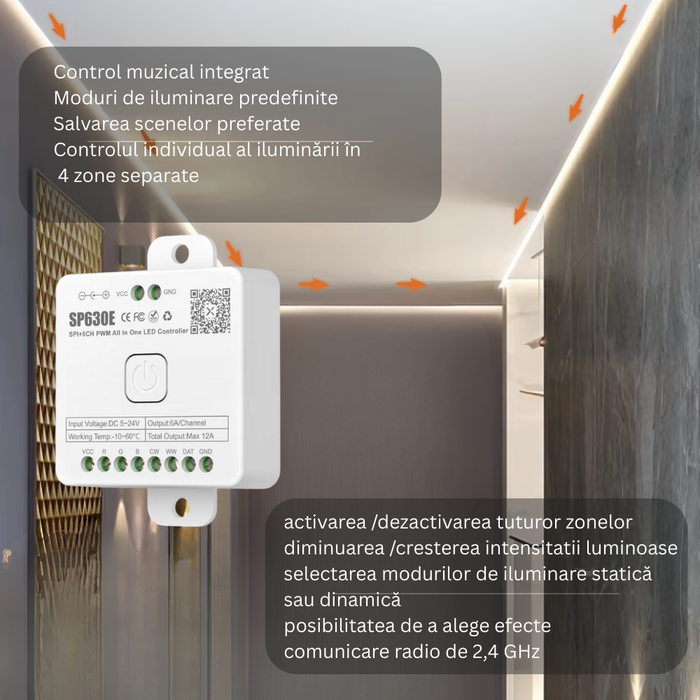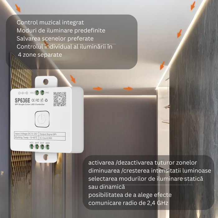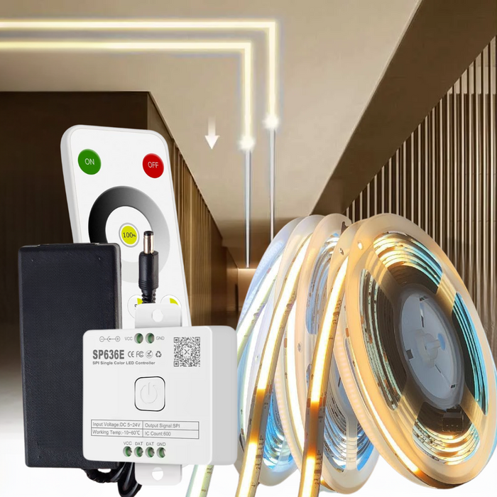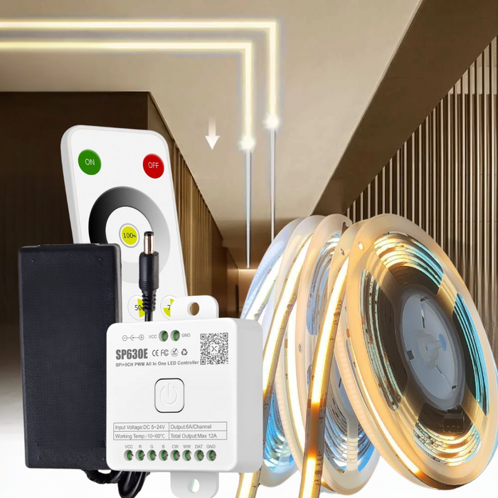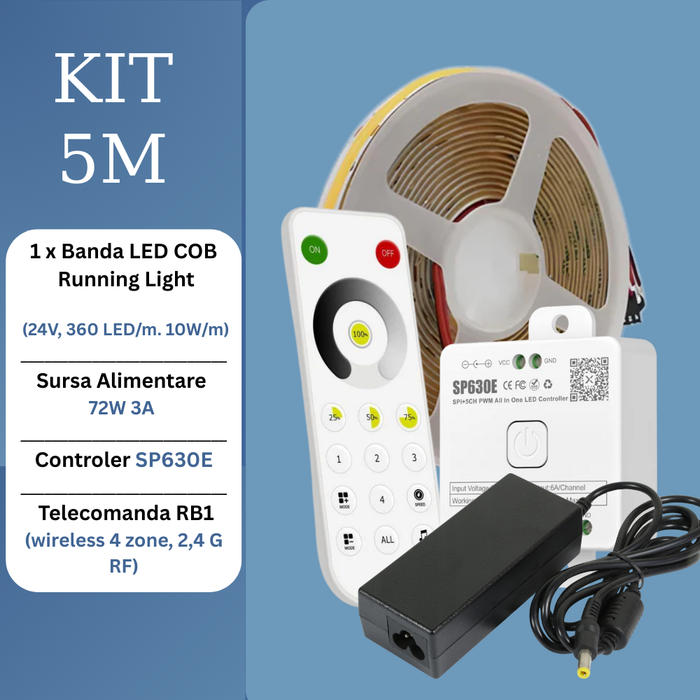 Kitul include o bandă LED COB de 5 metri, disponibila in 3 temperaturi de culoare la alegere, o sursă de alimentare de 24V, un controler SP630E All-in-One și o telecomandă digitală cu control pe zone (până la 4 zone) tot ce ai nevoie pentru o experiență de iluminare dinamică, modernă și complet personalizabilă.