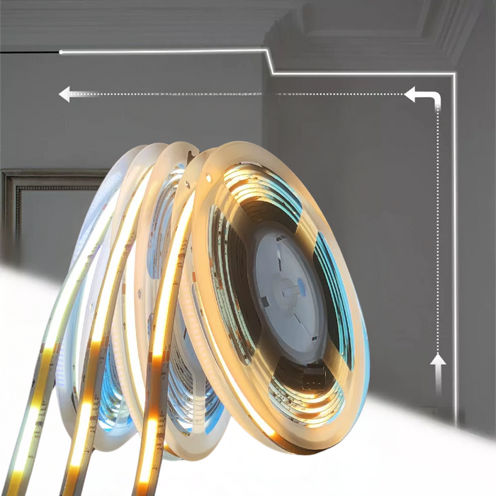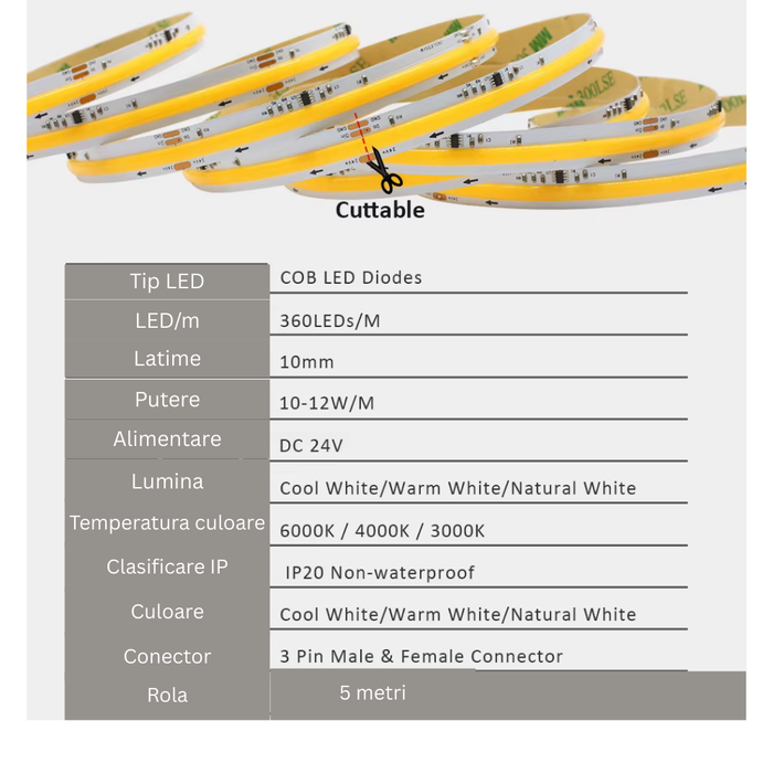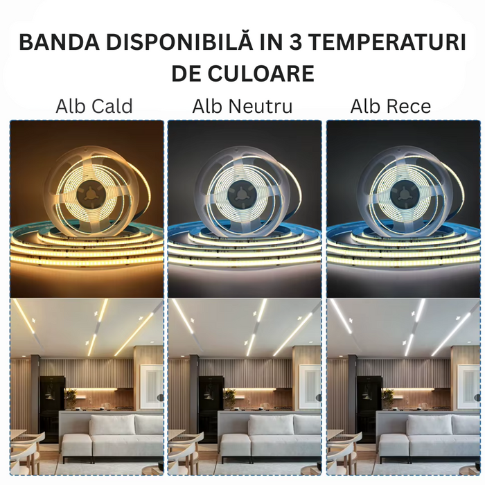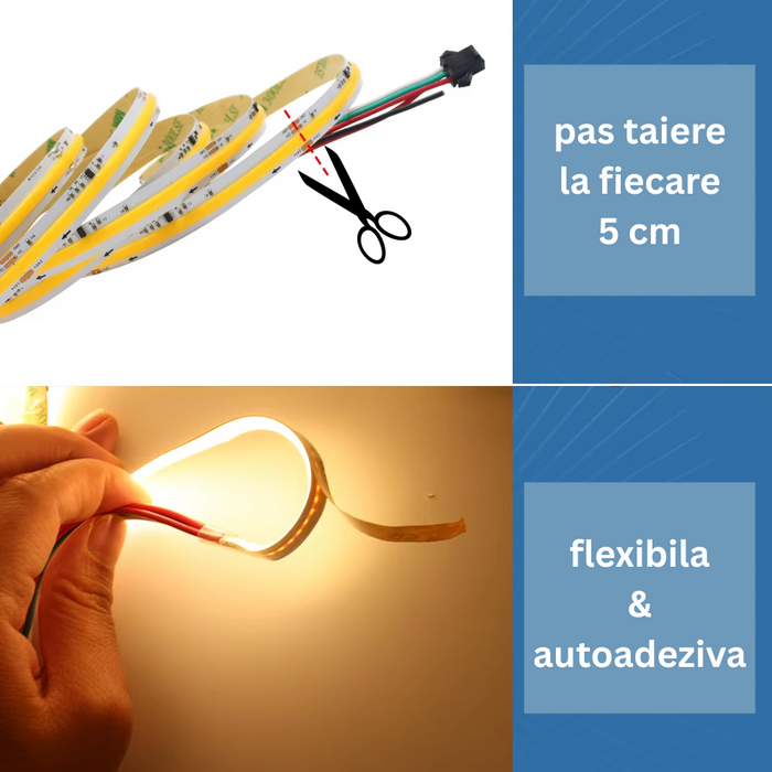 Datorită tehnologiei COB și densității mari (360 LED-uri/m), banda oferă o lumină perfect uniformă – ideală pentru spații elegante, comerciale sau decorative.