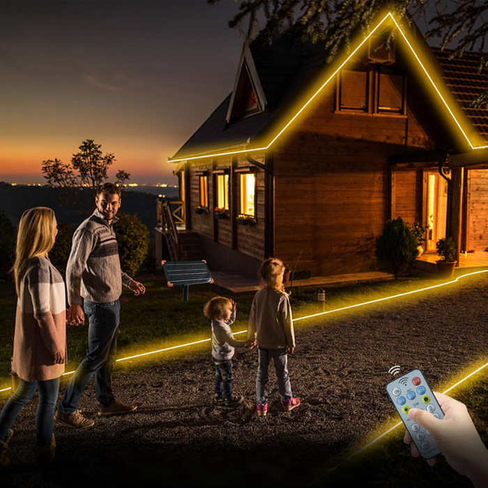 Kit Bandă LED Solară 5 metri – Lumină Caldă 3000K, Dimabilă, cu Senzor Crepuscular, IP68, cu Telecomandă, 300LM – Exterior