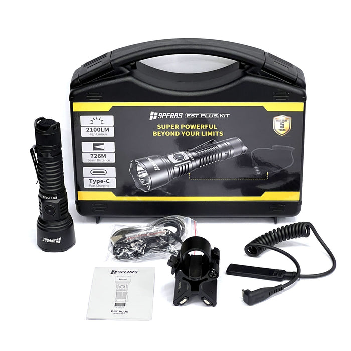 Kit-ul este format din Lanterna Speras EST Plus in cutie transport si accesorii precum acumulator lanterna, buton comanda la distanta, prindere magnetica si cablu reincarcare).