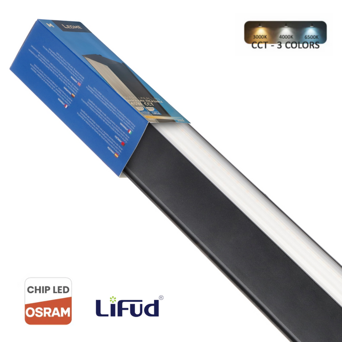 Lampă LED liniară cu dimensiuni de 1150 mm lungime, 60 mm latime si 70 mm inaltime, oferă o putere de 40 W. Echipata cu o sursa de lumina Osram, cu luminozitate de 4800 lumeni, temperatura de culoare CCT ( se poate alege temperatura de culoare dorita intre alb cald, neutru sau rece) si eficienta energetica cu un factor de putere de 0,95.