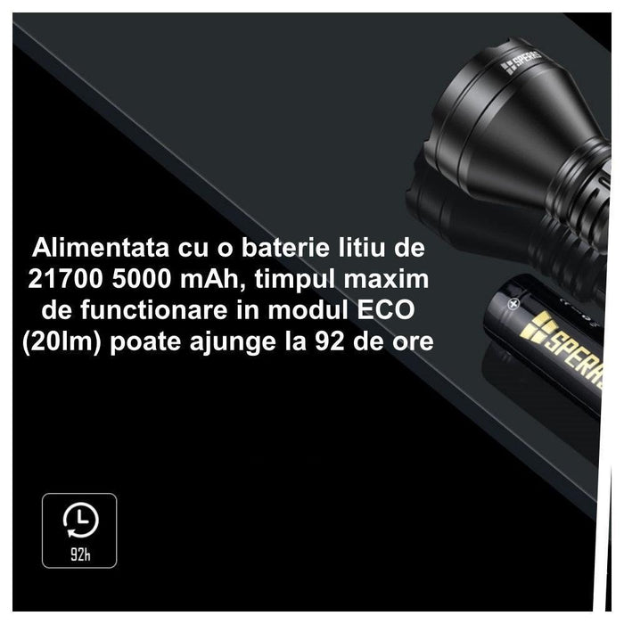 Alimentata cu o baterie cu litiu de 21700 5000 mAh, timpul maxim de functionare in modul ECO (20lm) poate ajunge la 92 de ore. Permite incarcare rapida de 5V/2A, iar timpul de incarcare este de aproximativ 3,7 ore. Speras T3R poate fi folosita si ca power bank.