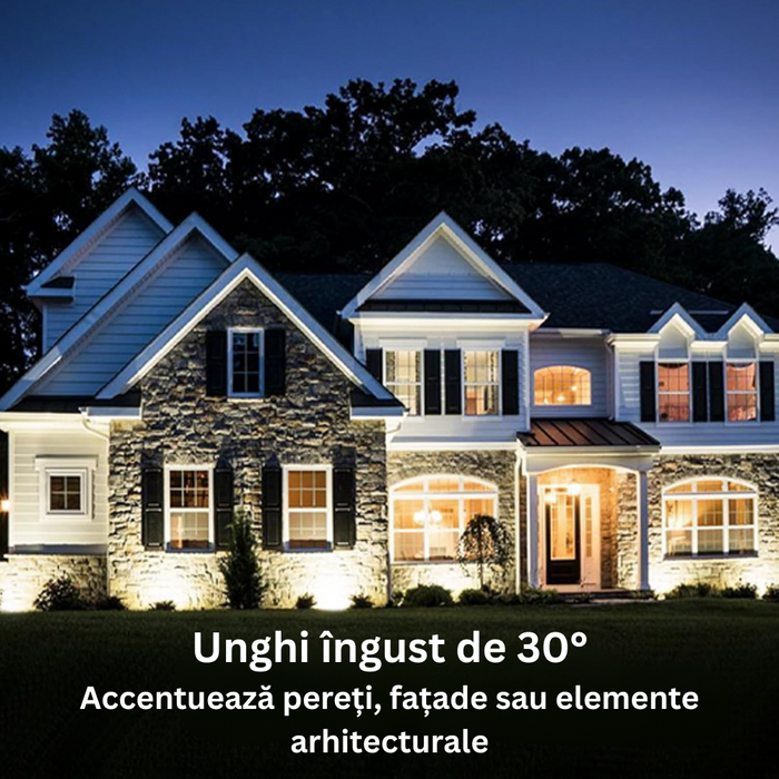 Designul compact, realizat din aluminiu rezistent, combină durabilitatea cu un aspect modern, în timp ce finisajul gri se integrează elegant în orice stil arhitectural. Cu un unghi de iluminare de 30°, este ideal pentru evidențierea fațadelor, pereților sau detaliilor arhitecturale.