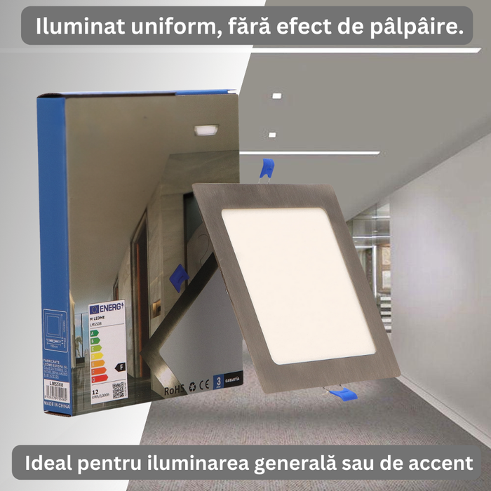 Spotul LED pătrat cu o putere de 12W, este o soluție modernă și eficientă pentru iluminarea interioară, oferind o lumină puternică cu un flux luminos de 1200 de lumeni. Cu tehnologia CCT acest spot permite ajustarea temperaturii de culoare (3000K, 4000K, 6000K), oferind flexibilitate pentru diverse atmosfere – de la o lumină caldă și relaxantă la o lumină rece și energizantă.