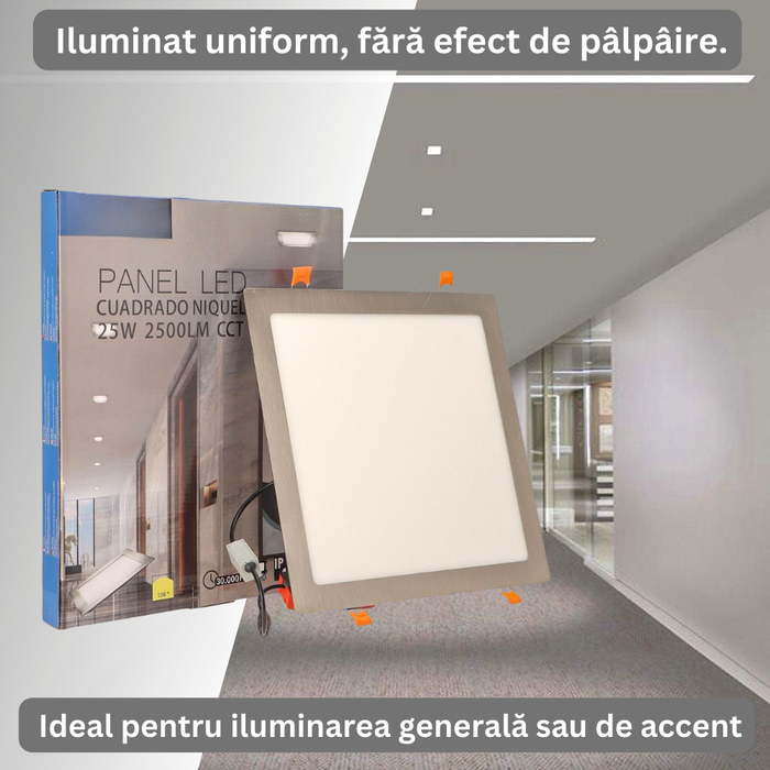 Spotul LED pătrat cu o putere de 25W, este o soluție modernă și eficientă pentru iluminarea interioară, oferind o lumină puternică cu un flux luminos de 2500 de lumeni. Cu tehnologia CCT acest spot permite ajustarea temperaturii de culoare (3000K, 4000K, 6000K), oferind flexibilitate pentru diverse atmosfere – de la o lumină caldă și relaxantă la o lumină rece și energizantă.