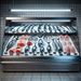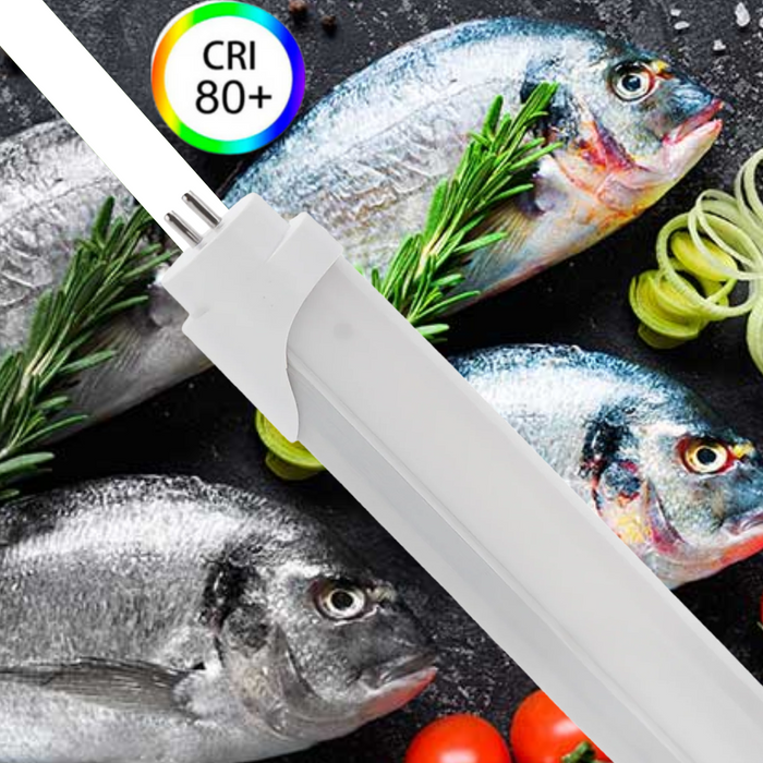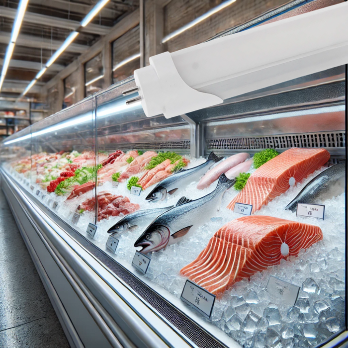 Tub LED T8 din aluminiu cu lungime de 120 cm oferă o lumină rece, special concepută să pună în valoare prospețimea și culoarea naturală a peștelui și a fructelor de mare.Cu un consum redus de 17W și alimentare la un capăt, tubul asigură o iluminare uniformă și clară, ideală pentru vitrinele frigorifice din carmangerii și magazine specializate.