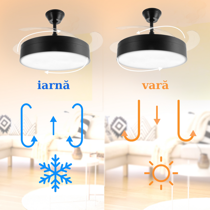 Funcția de iarnă - modificarea direcției de rotație a lamelor, distribuind uniform căldura de la instalația de caldură care se ridică spre tavan în timpul iernii.