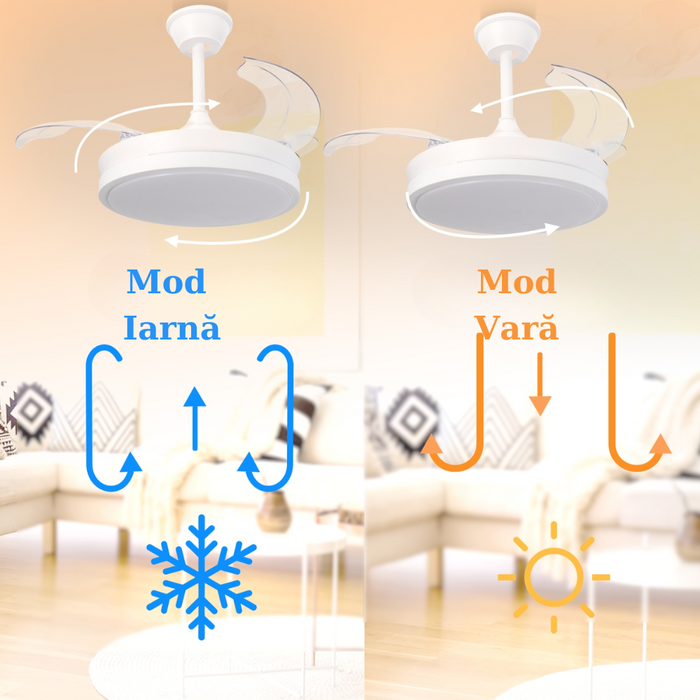 Funcția de iarnă modificarea direcției de rotație a lamelor, distribuind uniform căldura de la instalația de caldură care se ridică spre tavan în timpul iernii.